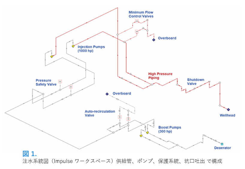 海洋生産プラットフォームの拡張プロジェクトにおける注水系統の評価を Impulse による過渡解析で実施した事例です。