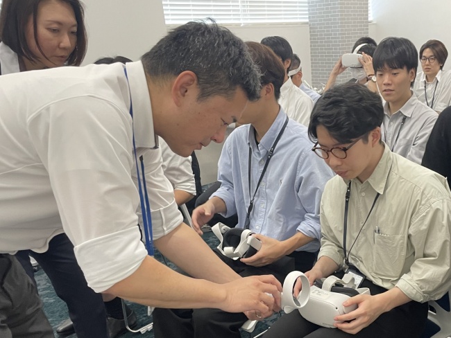 会場の丸岡オフィスにてVRゴーグルを装着して動画を視聴することで