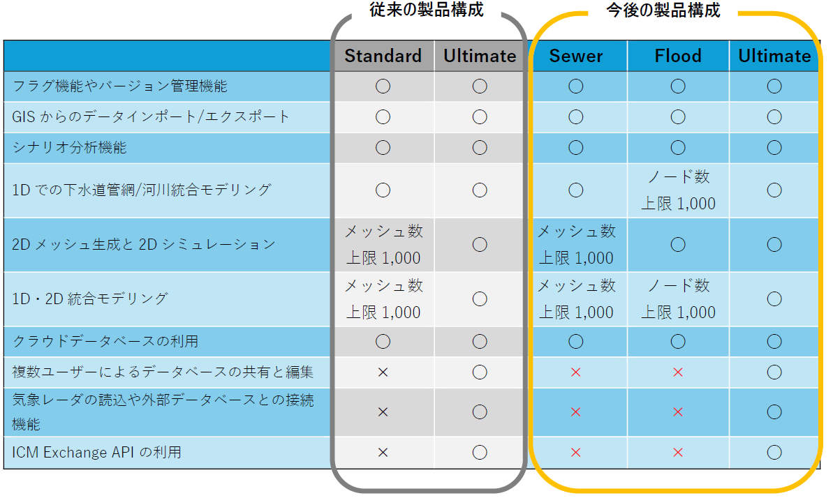 下表は、InfoWorks ICM Sewer、Flood、Ultimate の機能を比較したものとなります。ご確認ください。