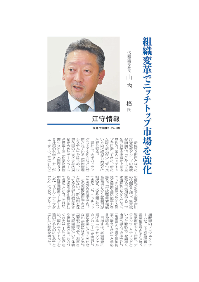 明けましておめでとうございます 旧年中は格別のご厚情を賜り誠にありがとうございました 本年も、江守情報グループはIT事業を通じて社会貢献・地域貢献に努めて参ります より一層ご支援お引き立てを賜りますようお願い申し上げますとともに 皆様のご健康とご多幸をお祈り申し上げます さて、1月1日 福井新聞『2026 新春トップインタビュー 』にて 弊社代表取締役社長 山内格 の年頭所感を掲載していただきました ご一読いただければ幸いです