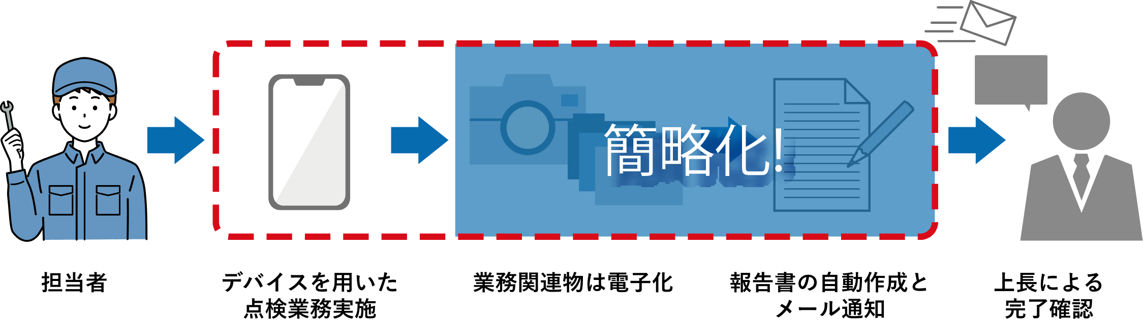 従来、点検業務の際に、マニュアル等の紙媒体やカメラの持参が必要になります。 業務ではマニュアルに記載された手順を確認、カメラ等でのエビデンスを取得、結果を点検台帳等に記載します。 業務完了後は報告書の作成や専用システムへの入力作業などが発生することもあります。一方、WorkfloPlusはモバイルアプリ上で手順が表示されます。 手順には、文字による指示だけでなく静止画・動画・PDFといったデータファイルを添付することができ、注意点やコメントも残せるため、業務中における作業ミスを軽減します。業務完了後は、報告書が自動作成され、上長へメール通知すると同時にデータとしてオンラインで管理、見える化することが可能です。